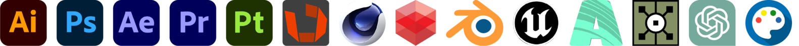 My technical skills include over 6 years of experience with Adobe Illustrator and After Effects (as well as Photoshop and Premiere), and mastery of 3D graphics and animation using C4D(+Redshift), Blender, Substance Painter, and UE5. I also explore the possibilities of neural networks (Stable Diffusion, Runaway GEN-2, Chat GPT) to simplify processes and offer you greater variety.
